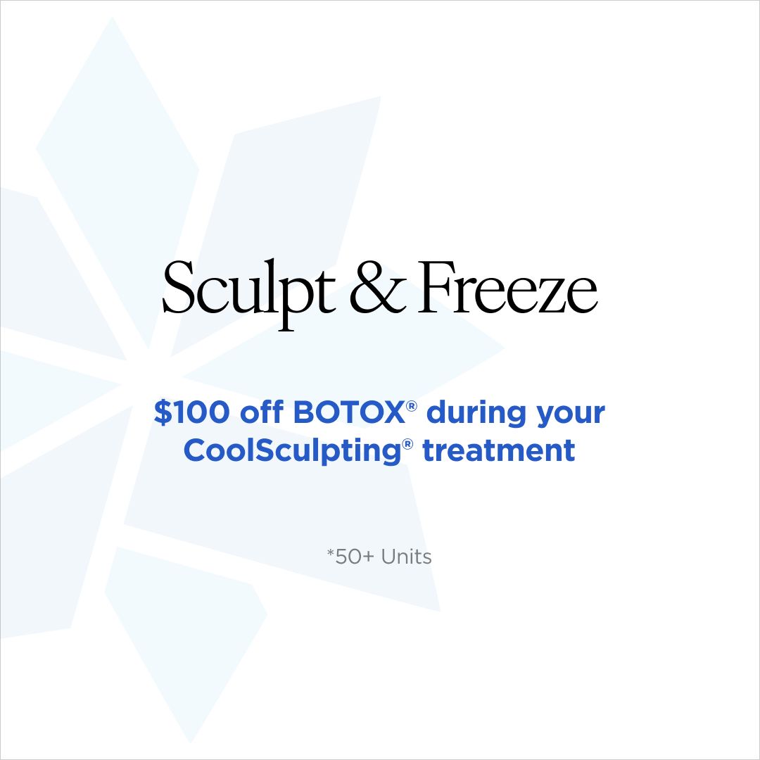 *Botox and Dysport: 50 units or more. No banking on Botox or Filler. While supplies last. All procedures, services, and treatments must be deemed medically appropriate by CPS or TSC providers prior to use; consultation or assessment may be required. Cannot be combined with any other offer except Alle, Allergan gift cards, and Exclusively Yours. Cannot be applied to past purchases. Promotions are non-transferable, no refunds, exchanges, or substitutions. Prepayment of CoolSculpting package is required to receive maximum discount. For best results, we recommend completion of the full series of treatments, and no refunds for partial series of treatments. Valid on Future Purchases only. Valid on Future Purchases only -- appointment must be completed by 1.31.2025.